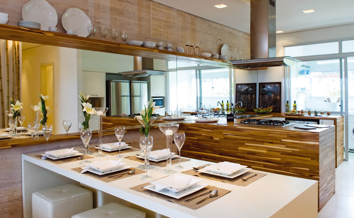 De 'gueto', a cozinha passa a ser uma área de estar...uma extensão aos demais ambientes, principalmente ao living e a varanda, que inclusive hoje, em sua homenagem, ganhou sobrenome: 'Varanda Gourmet'. Estações de trabalho literalmente, tornam-se Ilhas, bancadas, tudo amplo e aberto, formam palcos de performance gastronômicas, onde acomodados confortavelmente como num camarote, os convidados apreciam de perto o show entre uma taça e outra de um saboroso vinho, escolhido a dedo pelo 'Chef da vez'. Silenciosas, mas sem passar desapercebidas, estão as coifas, de design cada vez mais moderno, completam o cenário envolvente, que oferece um grande menu de degustação de sentidos e sentimentos, aguçando além de olfato e paladar, é claro, a sensação de aconchego e alegria, reunidos entre pessoas queridas.